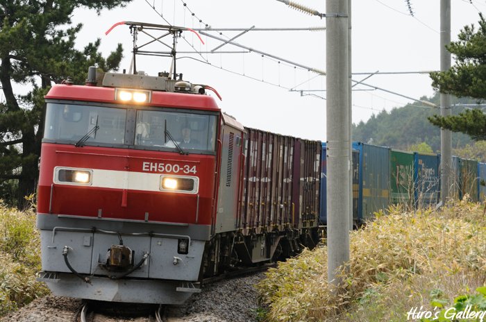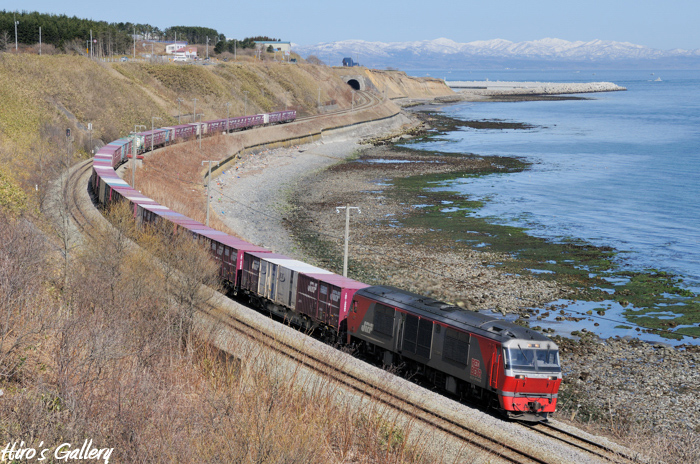 満載のコキを連ね、車体をくねらせて海峡沿いを進むその姿は、まさに主の風格が感じられますね。