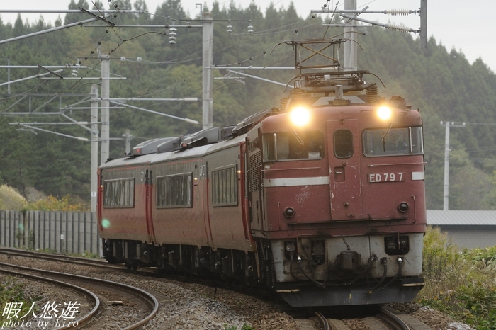 小雨の降る中をやってきた、ED79に牽引されて走るキハ183系和式気動車。