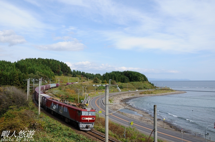 津軽海峡に沿って走るEH500「金太郎」牽引の貨物列車です。