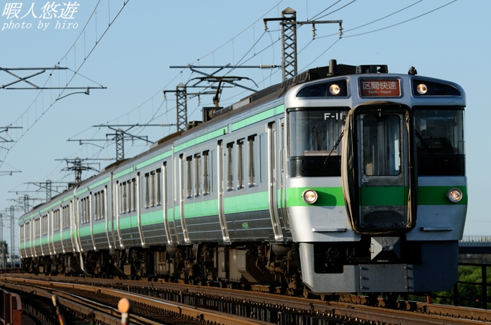 この時間帯の島松は太陽がやや低い位置から側光気味に挿しこむので、721系の足回りに光が当たってディティールがはっきりしています。