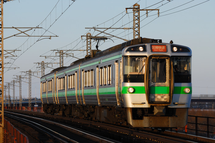 この前の日曜日に夕張川鉄橋で撮った721系「いしかりライナー」なのですが、お顔に夕日が反射してほんのりと赤くなっています(^^)