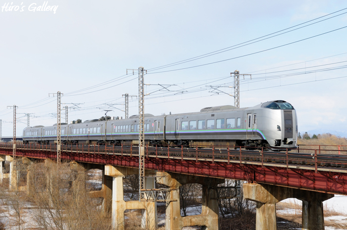 15時06分頃夕張川鉄橋を通る上り「スーパーカムイ」は光のある中を通過。